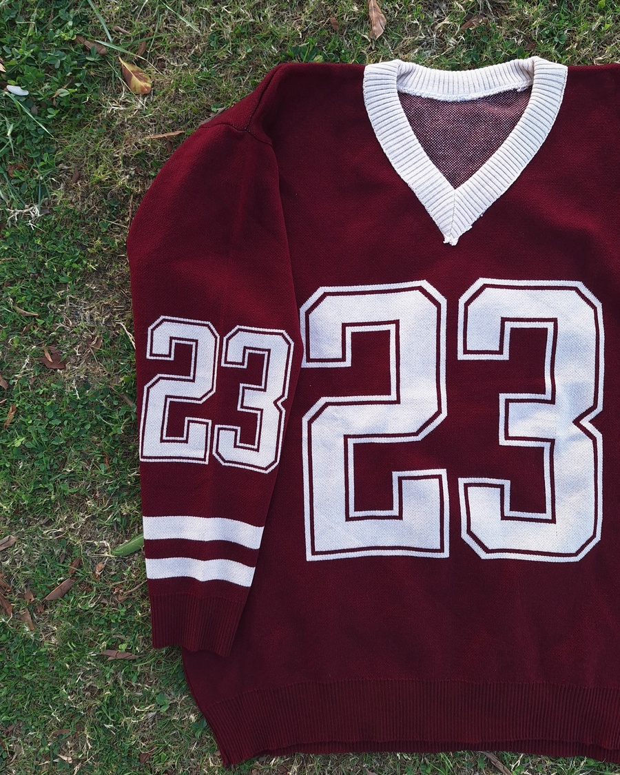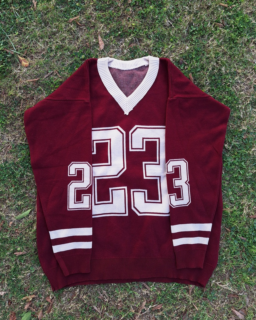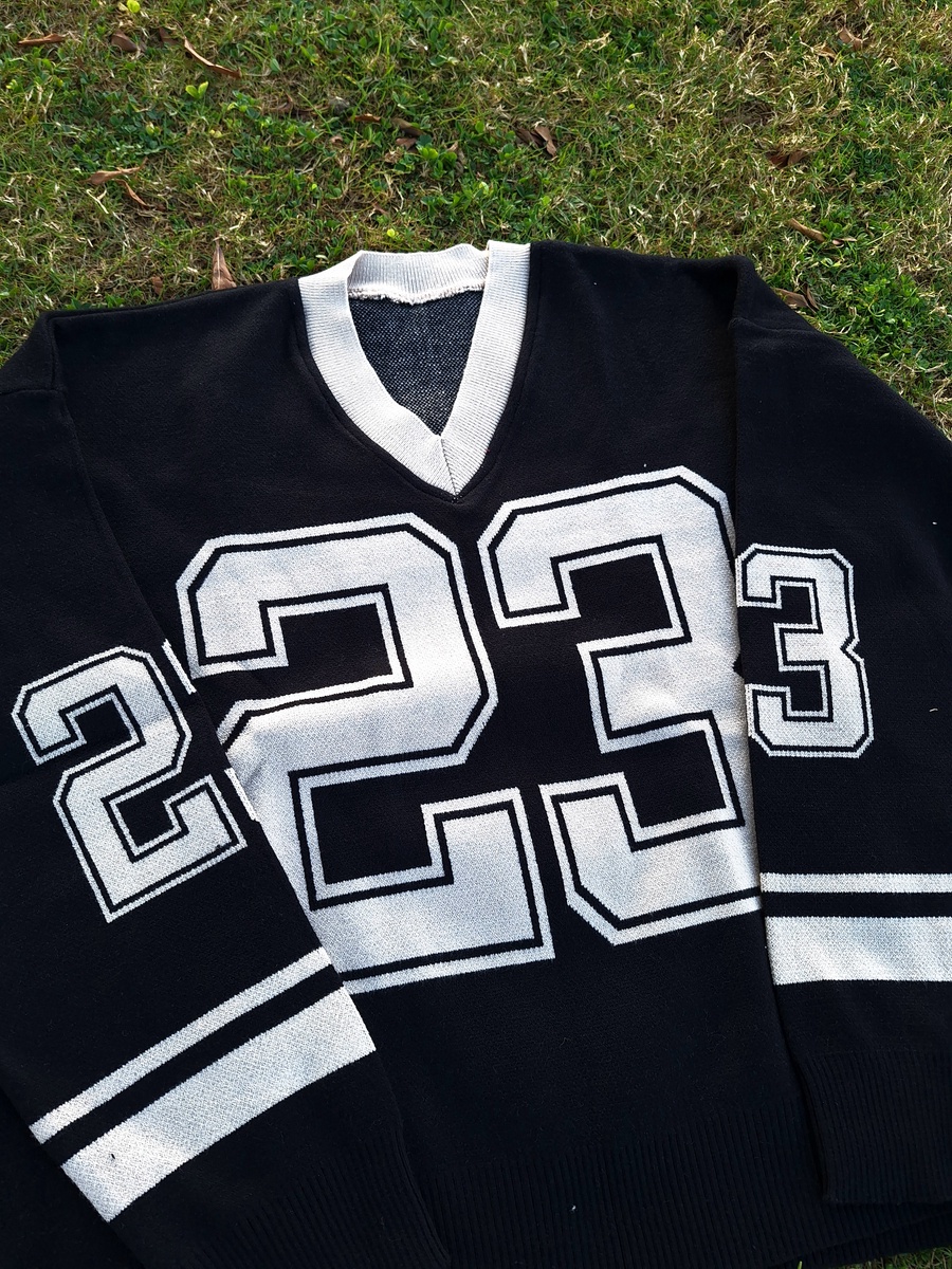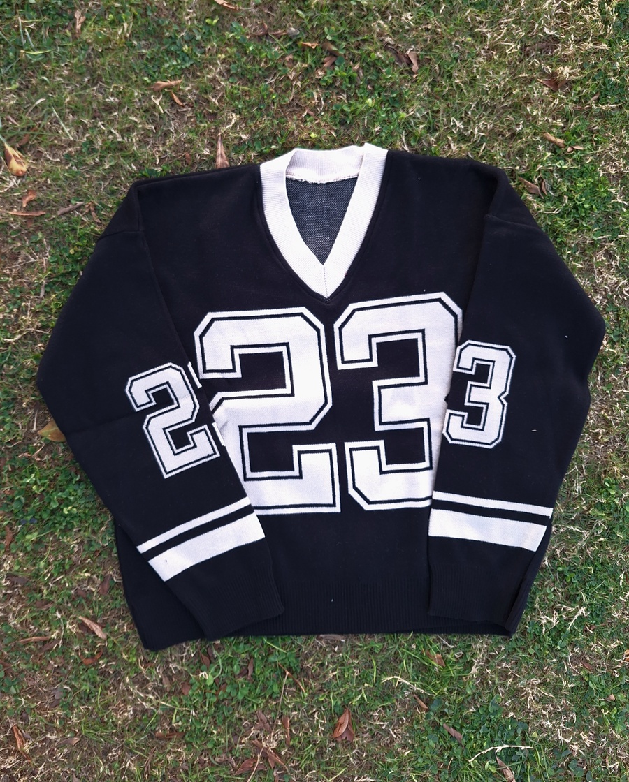 This V-neck pullover is crafted from high-quality "Agina" knit fabric, ensuring a smooth, thick, and premium feel. Featuring a bold "23" graphic and athletic stripes on the sleeves, it’s the perfect piece for a trendy, oversized look that doesn't sacrifice comfort.