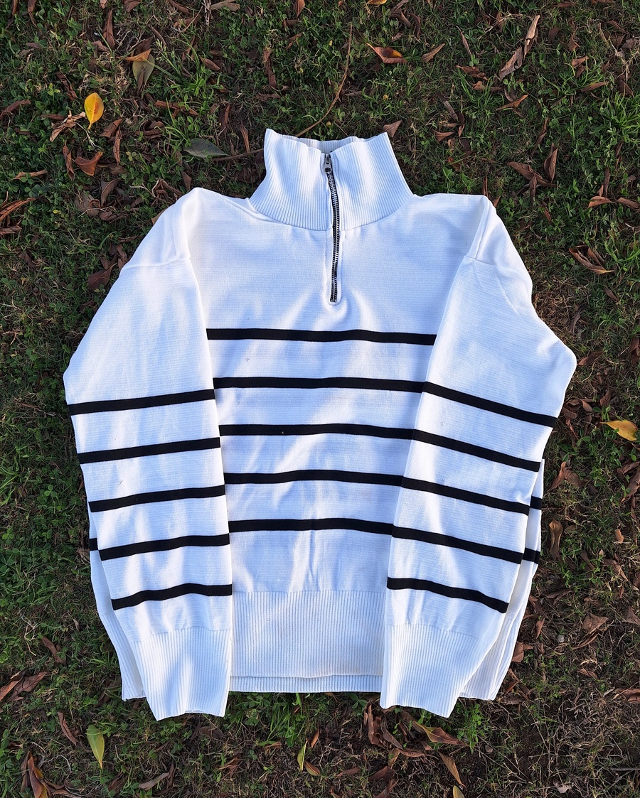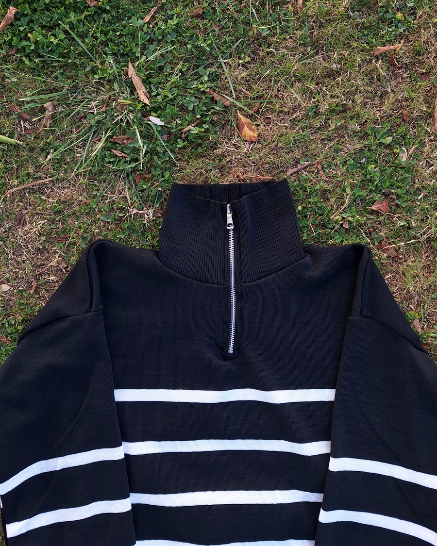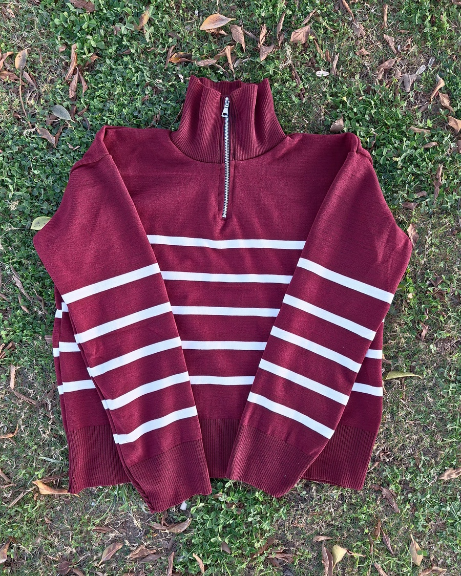Master the art of effortless style with our Half-Zip Striped Knit Sweater.