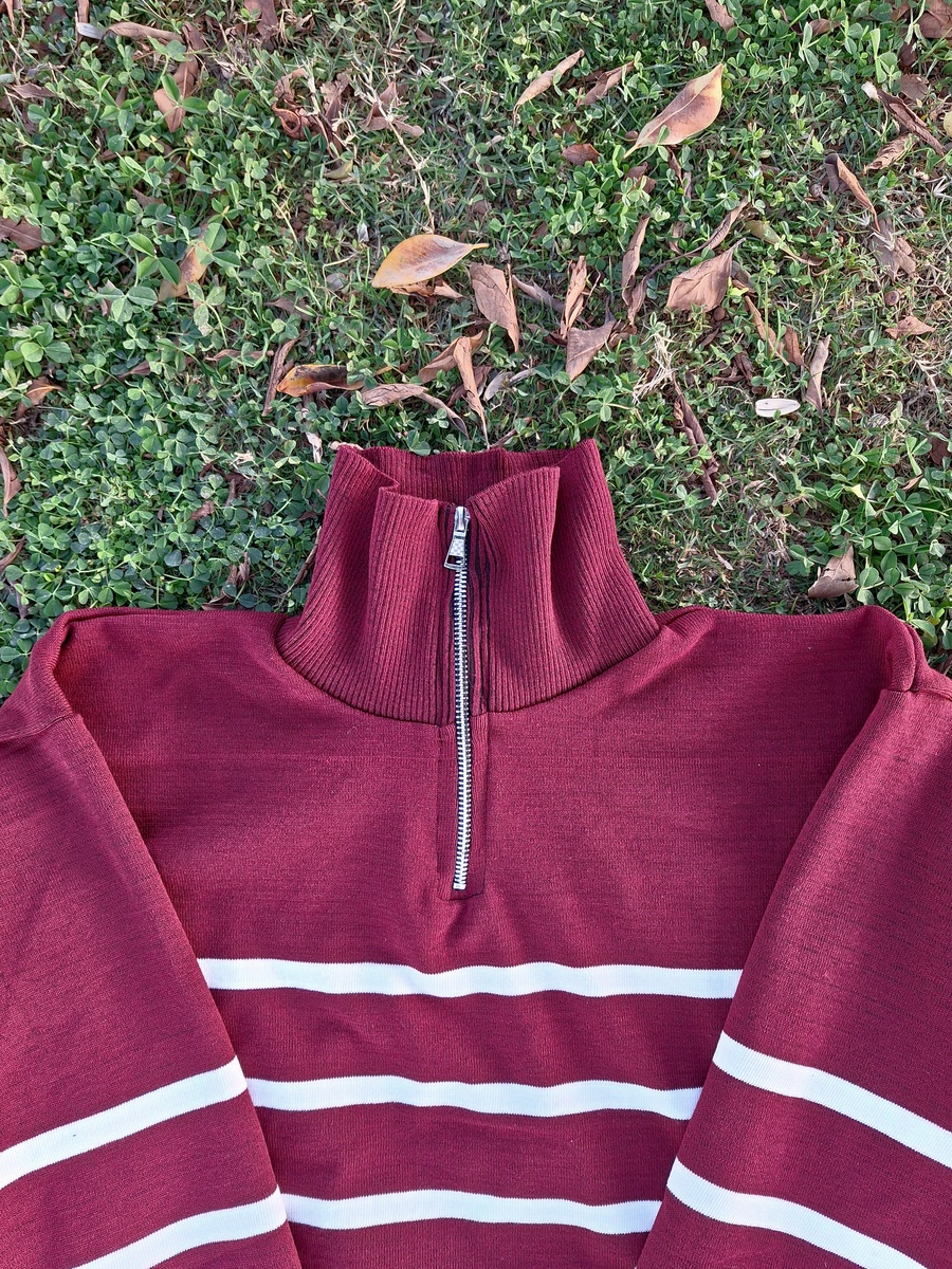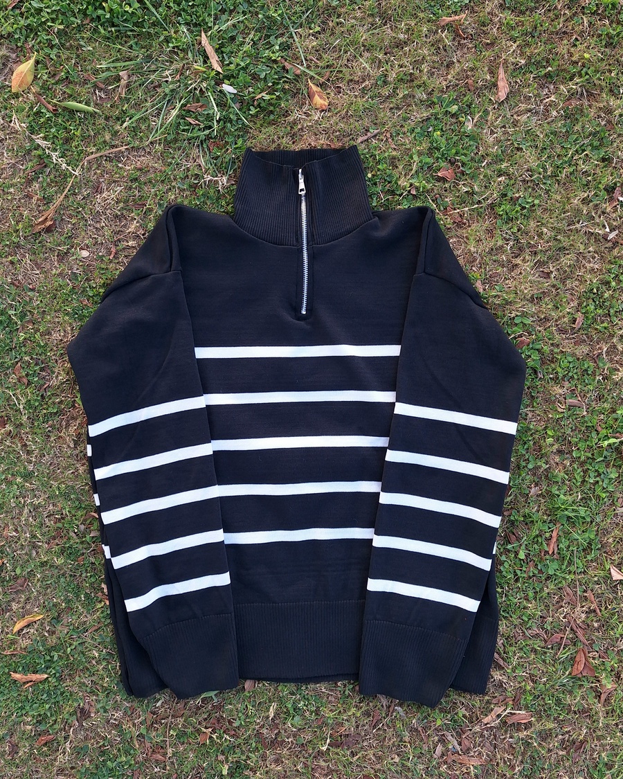This versatile pullover is made from premium "Agina" knit fabric, known for its buttery-soft feel and durability. Featuring a sleek metal half-zip and bold horizontal stripes, it’s designed to provide warmth without feeling bulky. The high-neck design allows you to style it zipped up for extra warmth or open for a more relaxed look.