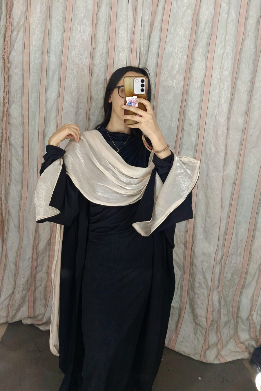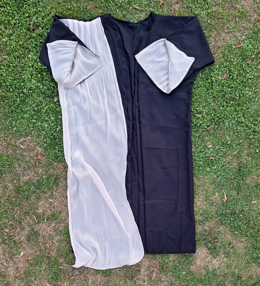 This stunning piece is designed for those who seek a blend of traditional modesty and modern luxury. The main body is crafted from Imported Rosalind fabric (روزالين مستورد), known for its smooth texture and elegant drape, perfectly complemented by a graceful Organza shawl (شال اورجانزا) that adds a touch of airy sophistication.